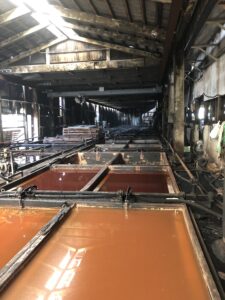 写真は、今では貴重なピット槽を持っているタンナーで浸透圧を使い薬剤を染み込ませ、ゆっくりと革の生産を行っています。